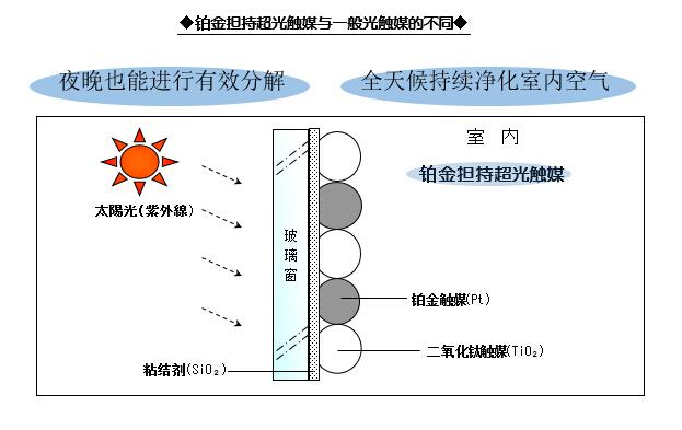 涂上空氣戰(zhàn)略鉑金擔(dān)持超光觸媒后、玻璃表面上附著著由二氧化鈦觸媒和鉑金觸媒組成的[鉑金二氧化鈦超光觸媒]以及使其固定在玻璃上的粘結(jié)劑。鉑金擔(dān)持超光觸媒通過太陽光中紫外線的照射,充分達(dá)到分解效果。所以將其涂抹于太陽光照射量最多的玻璃上時,能使其達(dá)到最大的分解效果。鉑金擔(dān)持超光